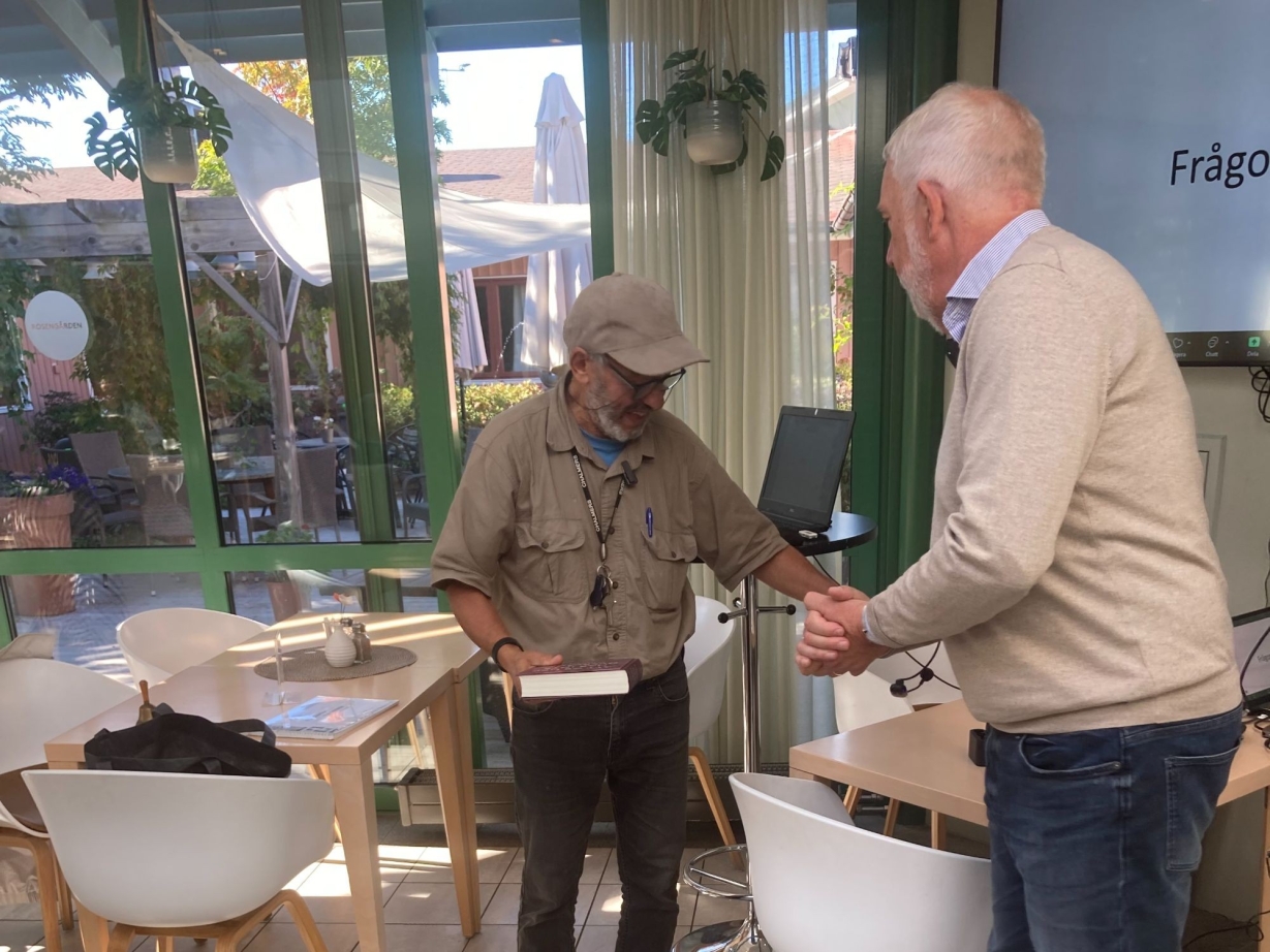På bilden tackar president Fredrik Saddek för ett intressant föredrag och visar vår uppskattning genom att överräcka boken "Att ge upp har aldrig övervägts"